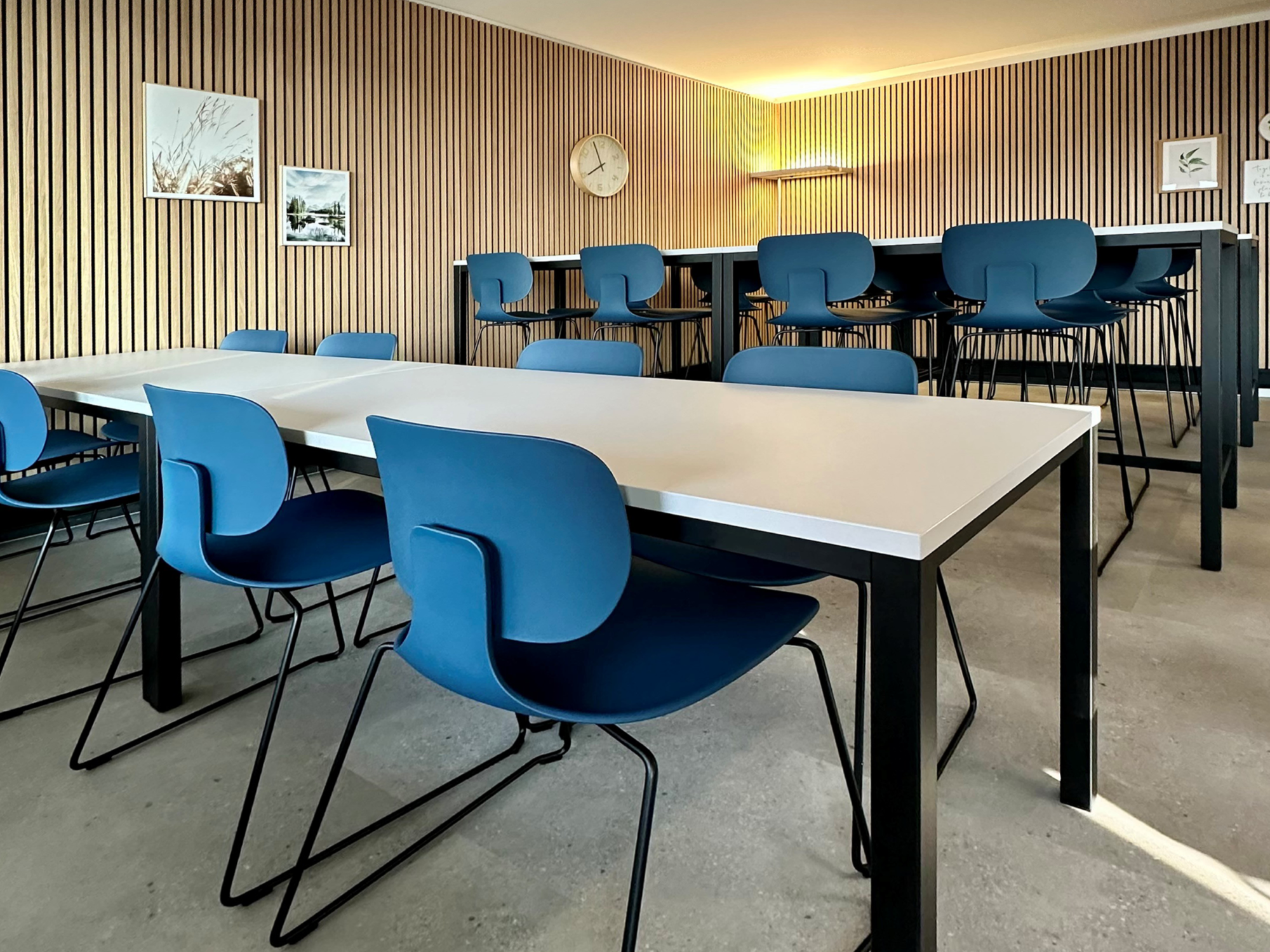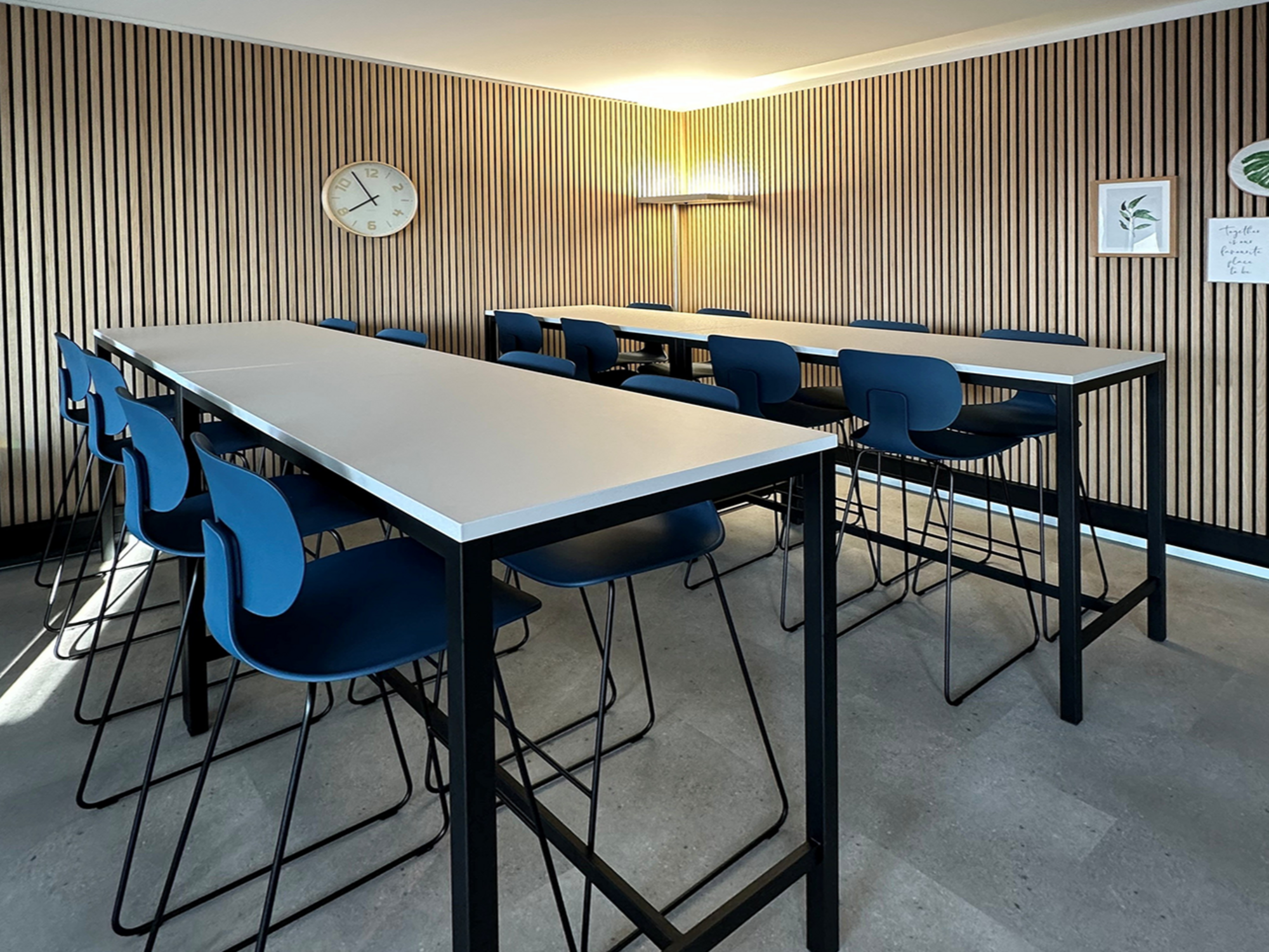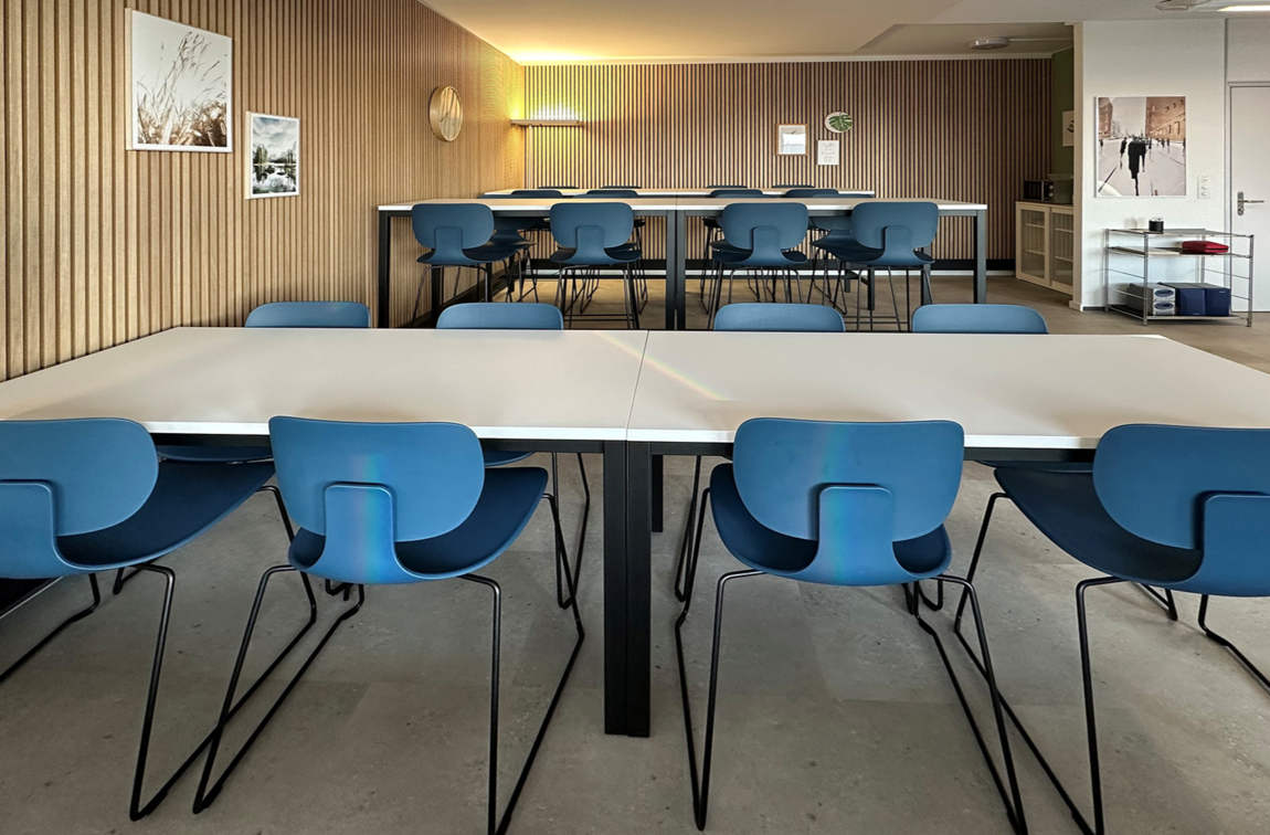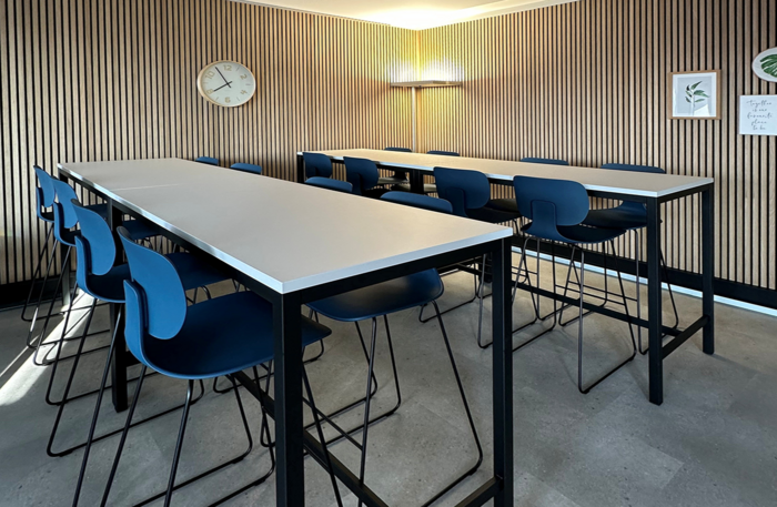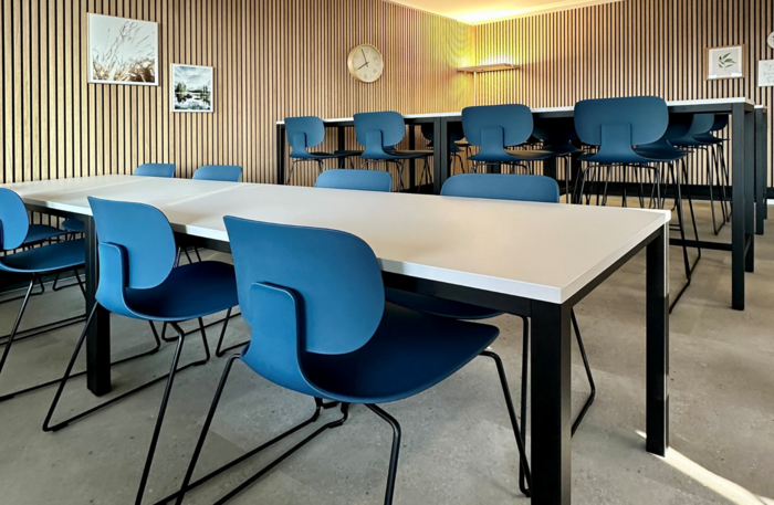 Der Aufenthaltsraum der Truvag AG in Sursee ist mit Sitz- und Hochtischen der Linie QUATTRO sowie Barhockern und Stühlen in CI-Farbe ausgestattet.