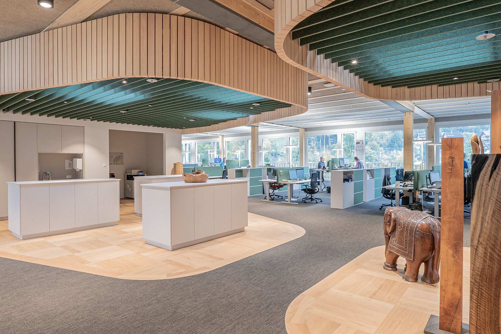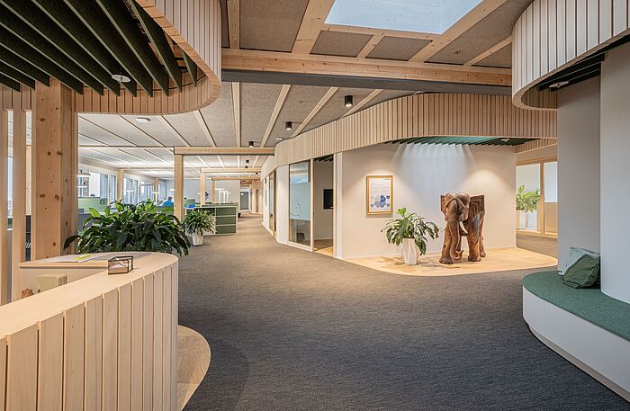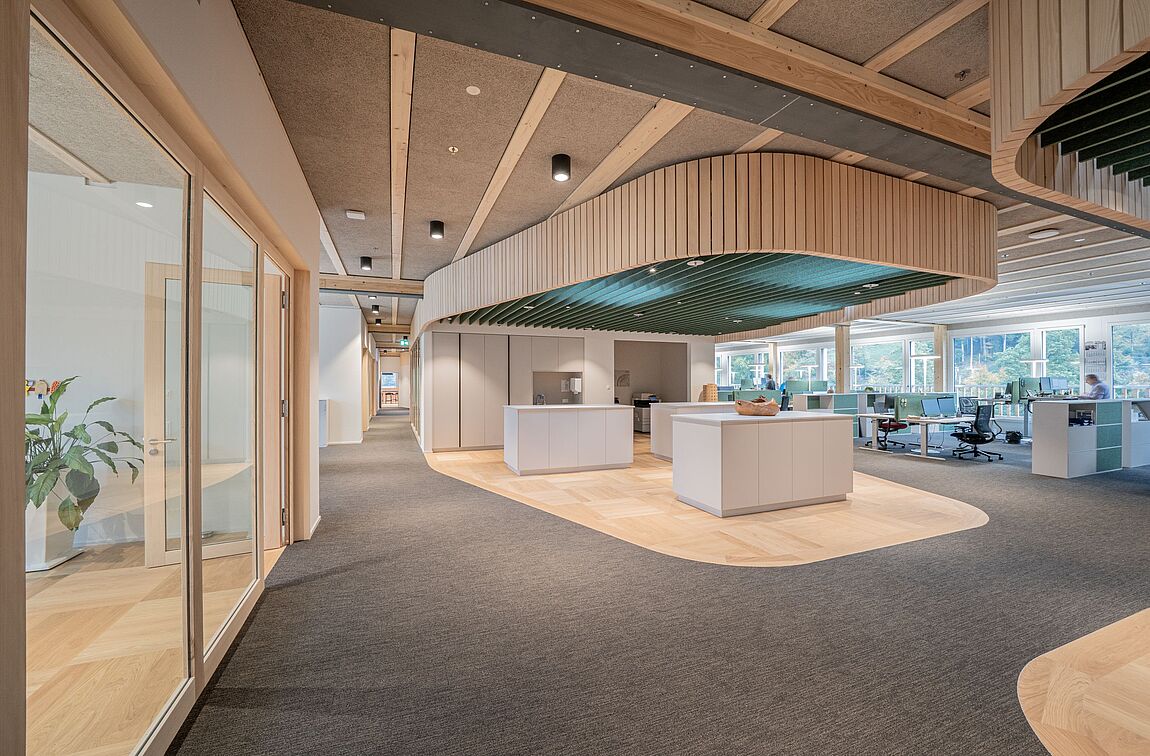 Der imposante Neubau der Herzog-Elmiger AG befindet sich in Kriens-Obernau. Als langjähriger Kunde bezieht die Zemp AG die Holz- und Holzwerkstoffe von Herzog-Elmiger in Obernau. Diese werden in Winikon zu hochwertigen Möbeln verarbeitet und fanden im Sinne eines gelebten Kreislaufs ihren Weg zurück nach Obernau – zur Ausstattung sämtlicher Arbeitswelten der Herzog-Elmiger AG.