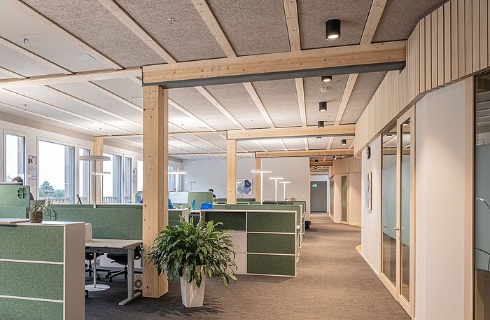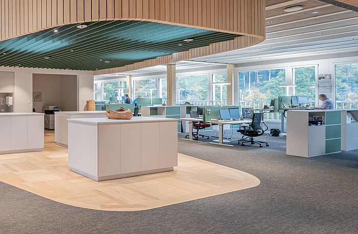 Die eingesetzten MIZO-Regale schaffen nicht nur grosszügigen Stauraum und klare Raumstrukturen, sondern dienen gleichzeitig als funktionale Raumteiler. Dank der verwendeten Materialien leisten sie zudem einen aktiven Beitrag zur Verbesserung der Raumakustik und tragen so zu einer angenehmen Arbeitsatmosphäre bei.